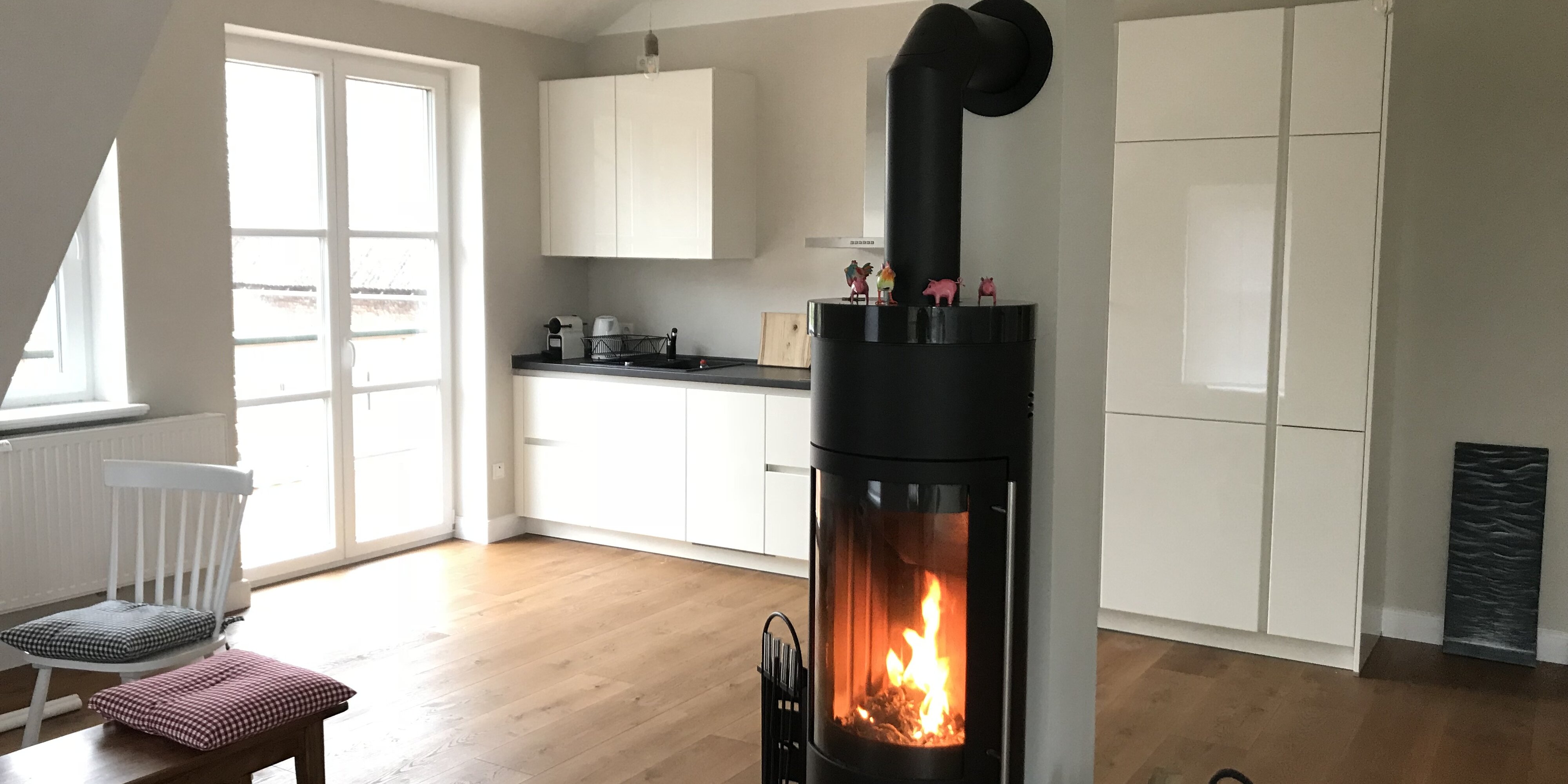 Individuelle Einrichtung und ausgewählte Materialien standen bei der Gestaltung im Vordergrund. Alle Wohnungen verfügen über Flachbildfernseher mit umfassenden Funktionalitäten. Ein sehr gutes W-Lan Netzwerk ist im gesamten Gebäude und Garten verfügbar. Für Ihre Fahrräder gibt es einen überdachten Fahrradständer mit Steckdosen für E-Bikes.